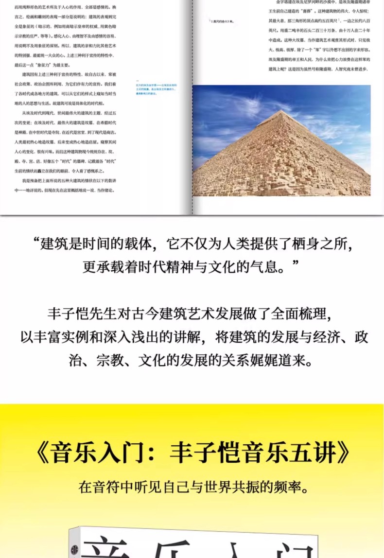 《認識建築》在《西洋建築演講》(1935年)的基礎上編輯而成,新版增添圖百餘幅。為什麼古埃及帝王要耗費巨大心力建造龐大而笨重的金字塔?為什麼希臘神殿的柱子上有一道細溝?為什麼早期的基督教堂都建在地下?全書對古今建築藝術發展做了全面梳理,以豐富實例和深入淺出的講解,融會貫通地揭示了建築背後的文化與藝術變遷。豐子愷先生在書中提到,“建築是時間的載體,它不僅為人類提供了棲身之所,更承載著時代精神與文化的氣息”,豐子愷憑藉自己深厚的藝術積淀,將建築的發展與經濟、政治、宗教、文化的發展關係細細分析,娓娓道來。