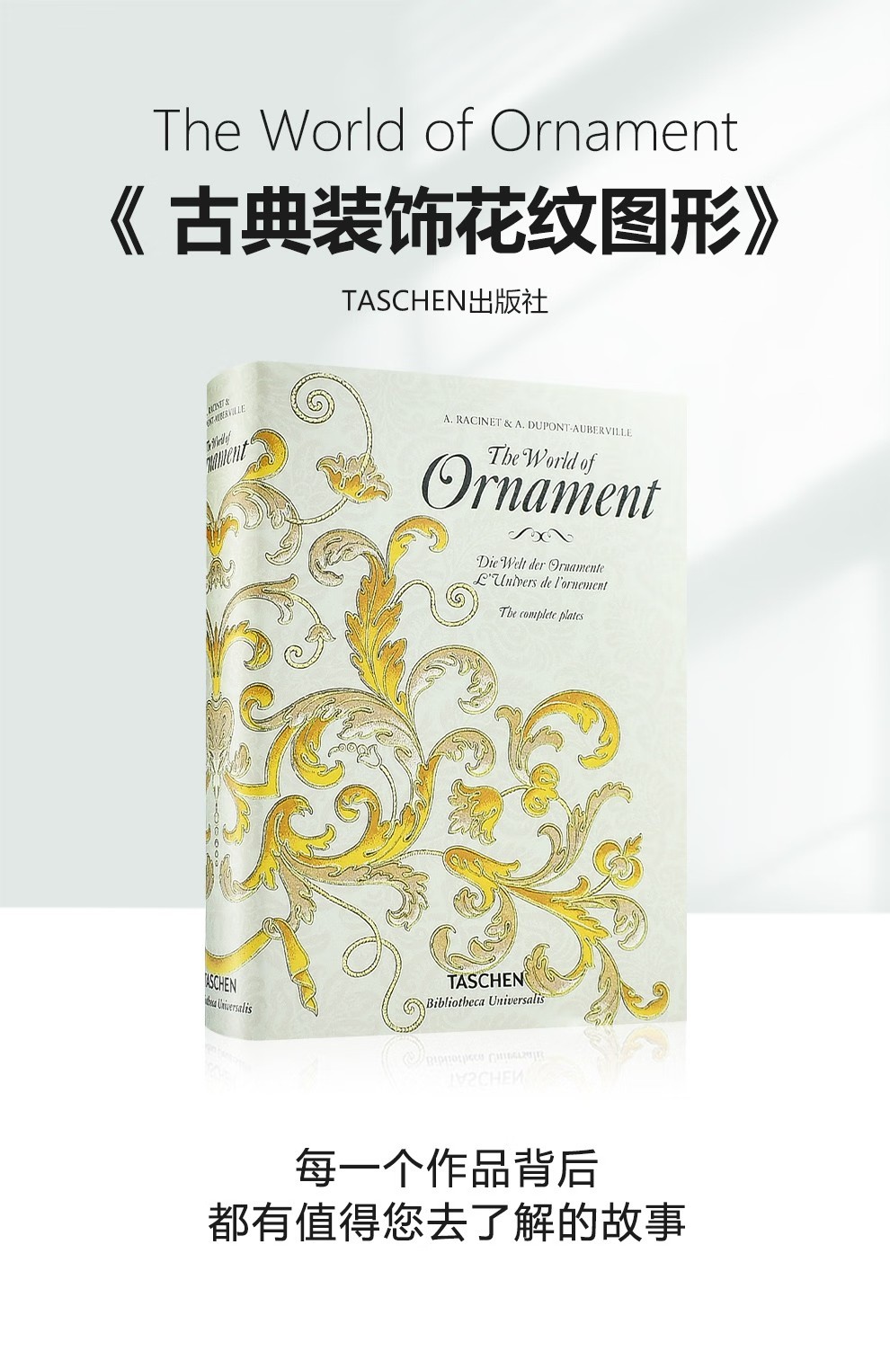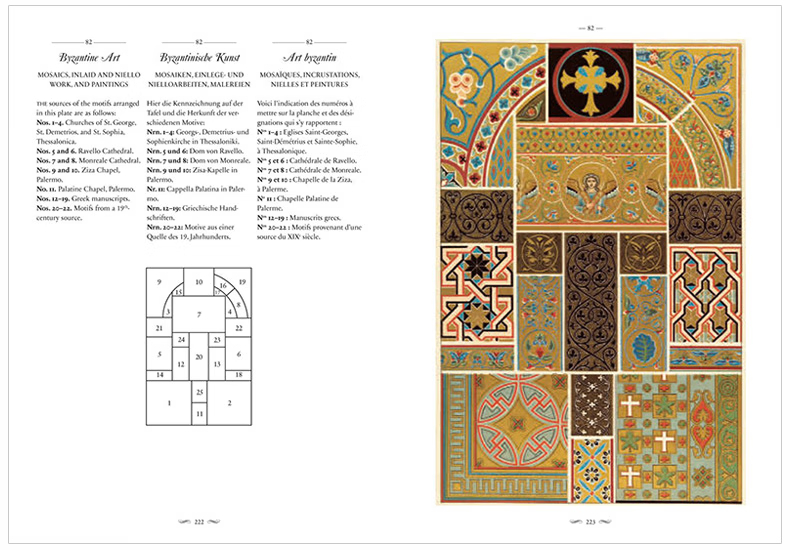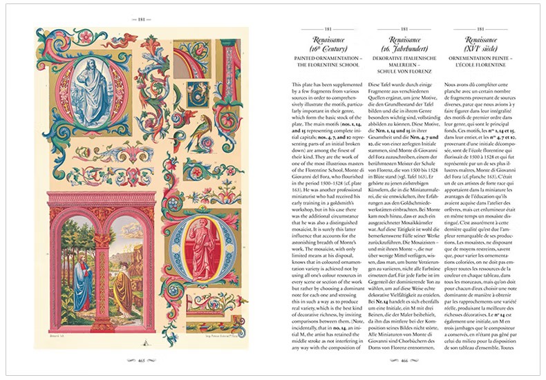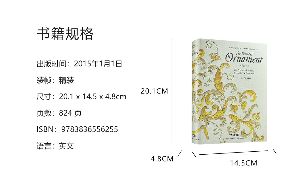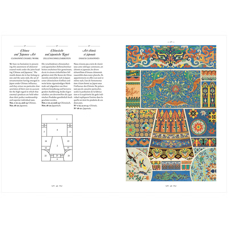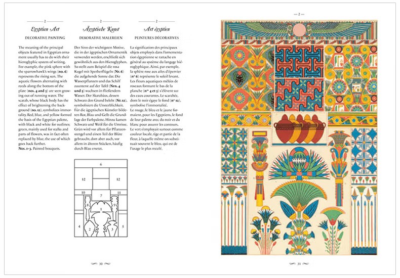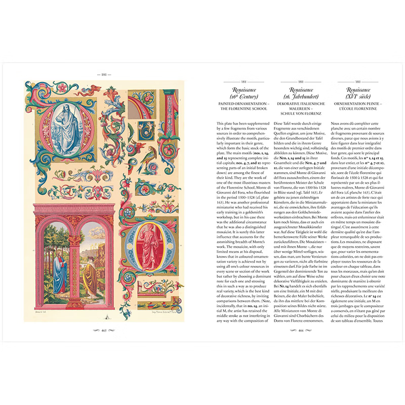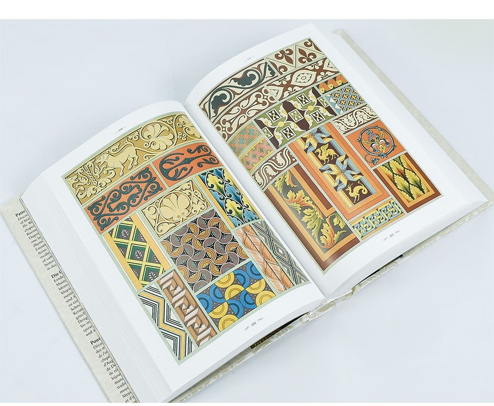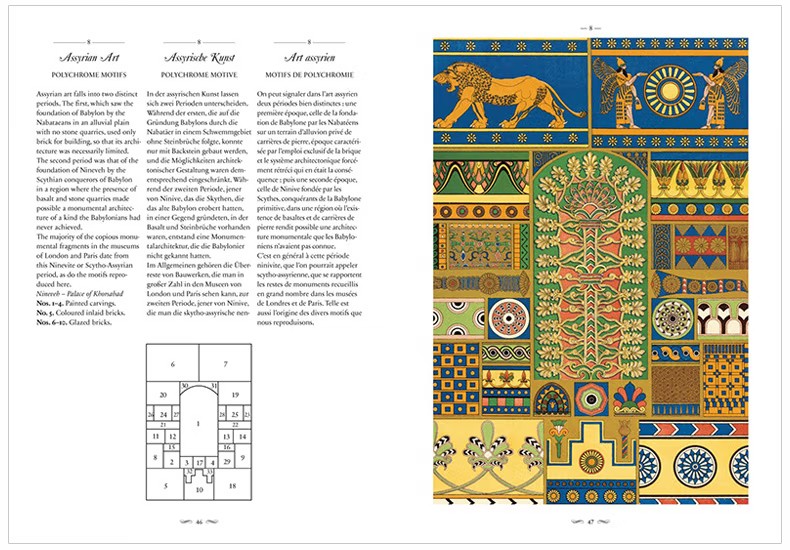 這部文化和美學彙編涵蓋了從中世紀到19 世紀的古典、埃及、希臘、羅馬、伊特魯裡亞、亞洲和中東以及歐洲設計,為藝術家、歷史學家、設計師和製版師提供了主要參考,任何從事裝飾設計和影響的人。