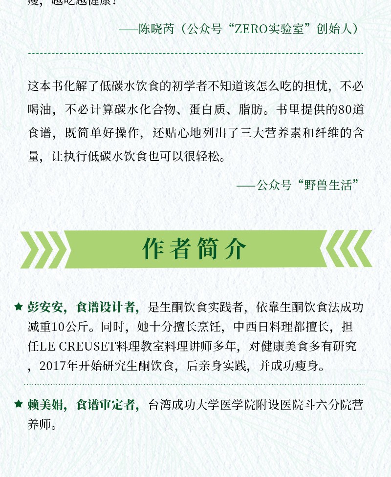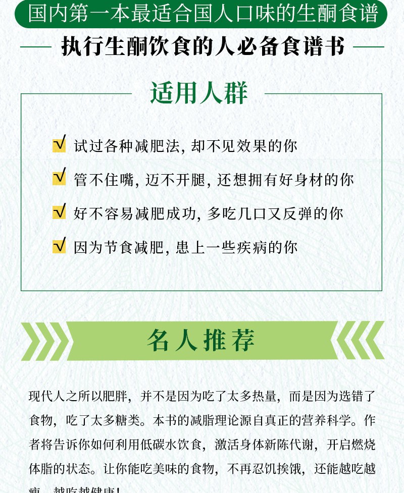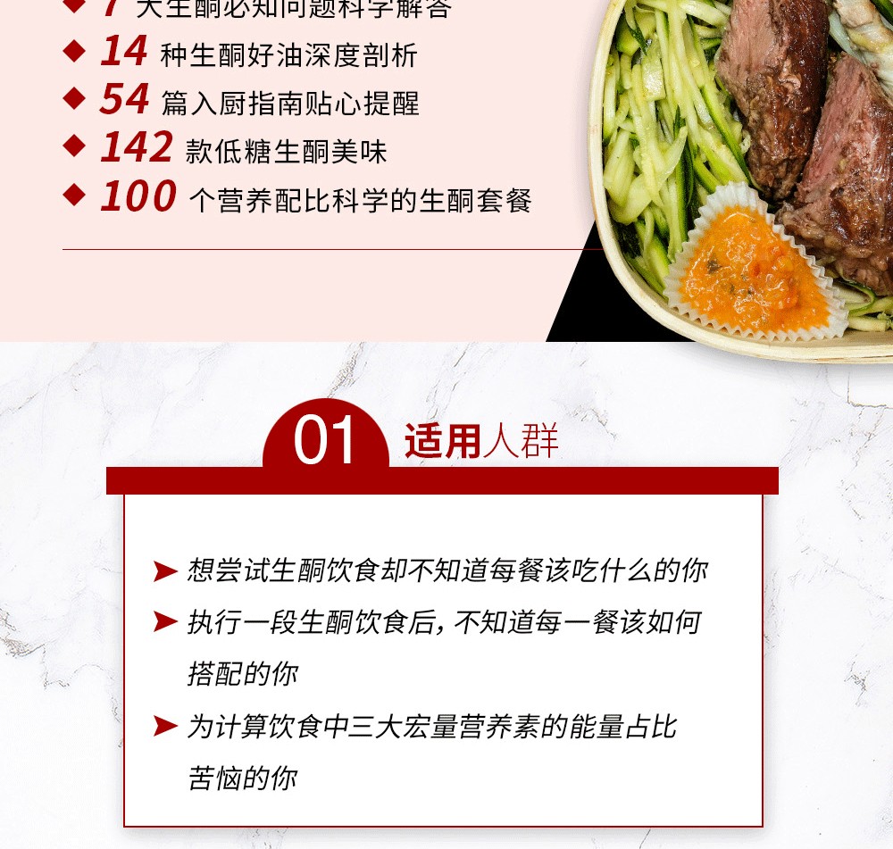 對於生酮飲食者來說,每天吃什麼菜很令人困擾,每一餐要如何搭配菜品更是讓人頭疼,大家往往苦惱於計算一餐中碳水化合物、脂肪、蛋白質的能連佔比,若是一不小心算錯,就會導致生酮失敗。本書不僅有142款美味,更有100個建議套餐,正好能解決大家的難題。