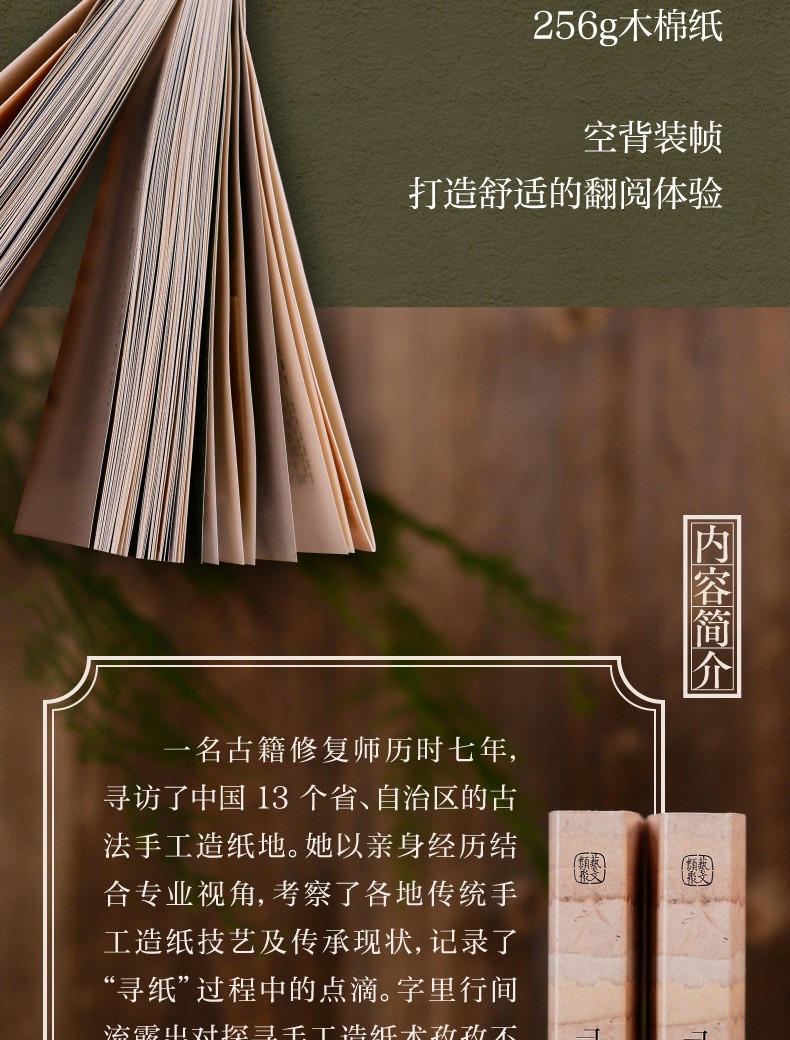 一名古籍修復師歷時七年,尋訪了中國13個省、自治區的全國古法手工造紙地。 她以親身經歷結合專業視角,考察了各地傳統手工造紙技藝及傳承現狀,記錄了「尋紙」過程中的點滴。 字裡行間流露出對探尋手工造紙術孜孜不倦的堅持,勾勒出一幅當代中國傳統手工紙製造業的現實畫卷。 冥冥之中的責任感、使命感不僅讓她與紙結緣,也驅使她開始現場考察古法手工紙誕生地的深入研究之旅。 本著對中國傳統手工造紙術的探尋之心,作者踏遍浙江、福建、山西、江西、貴州等十三個省自治區,遠及新疆的和田和海拔近3700公尺的西藏高原,親自帶回 書中所述的25種古法手工紙樣實物,將這項非物質文化遺產的現狀與傳承訓蓢道來。