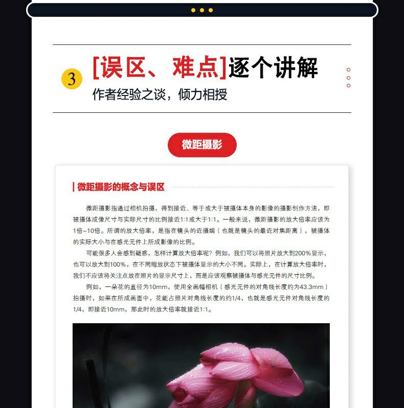 本書是本系列教程中的基礎篇。本書的主要內容包括相機的基本原理,相機的功能設定,曝光的基礎知識及技巧,光圈、快門速度、感光度等影響畫質的幾個重要因素,多種對焦技巧,鏡頭操作及性能,構圖的相關知識、技巧及經驗,色彩調整,等等。本書不採用教科書式的教學,沒有枯燥的參數組合,只是用簡單易懂的方式把艱澀難懂的攝影理論知識拆解教授給讀者。每個關鍵的攝影知識點,如光圈、快門、佈光等,通過理論結合案例的方式,系統地一一介紹。從相機操作、基礎理論,再到實拍技巧,本書旨在幫助攝影愛好者快速掌握攝影的理論,將生動瞬間留在鏡頭中。