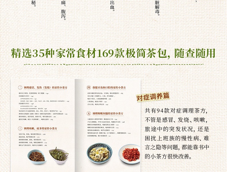 對症調養篇:共有94款對症調理茶方,不管是感冒、發燒、咳嗽,旅途中的突發狀況,還是困擾上班族的慢性病、難言之隱等問題,都能靠書中的小茶方很快改善。