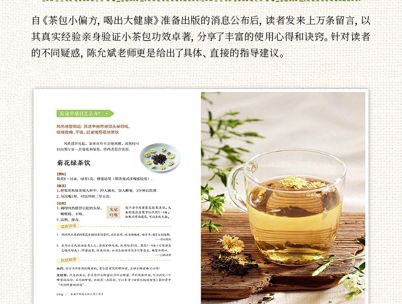 感謝“順時生活”的熱心讀者,自《茶包小偏方,喝出大健康》準備出版的消息公佈後,讀者發來上萬條留言,以其真實經驗,親身驗證小茶包功效卓著,分享了豐富的使用心得和訣竅。而針對讀者在實際使用中的不同疑惑,允斌老師 是給出了具體、直接的指導建議。