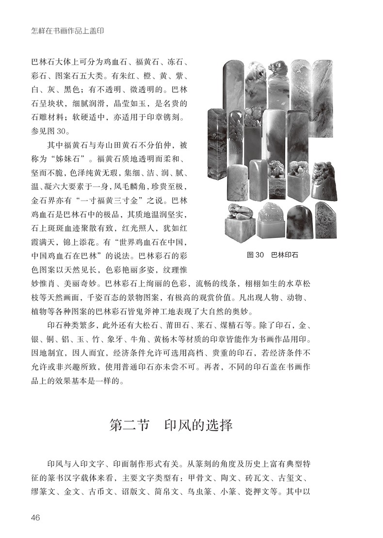 本書從專業角度介紹怎樣在書畫作品上蓋印,看標題會覺得此書很簡單,蓋印有什麼難的呢?其實不然,作者從印章的分類、印章的材質,以及印章的選用等方面深入地分析瞭如何選印、蓋印及注意事項。通過閱讀此書讀者可以清晰地了解關於書畫作品蓋印的問題,了解這些問題可以幫助書畫作者合理標準地使用印章,也能增加書畫作品的價值。