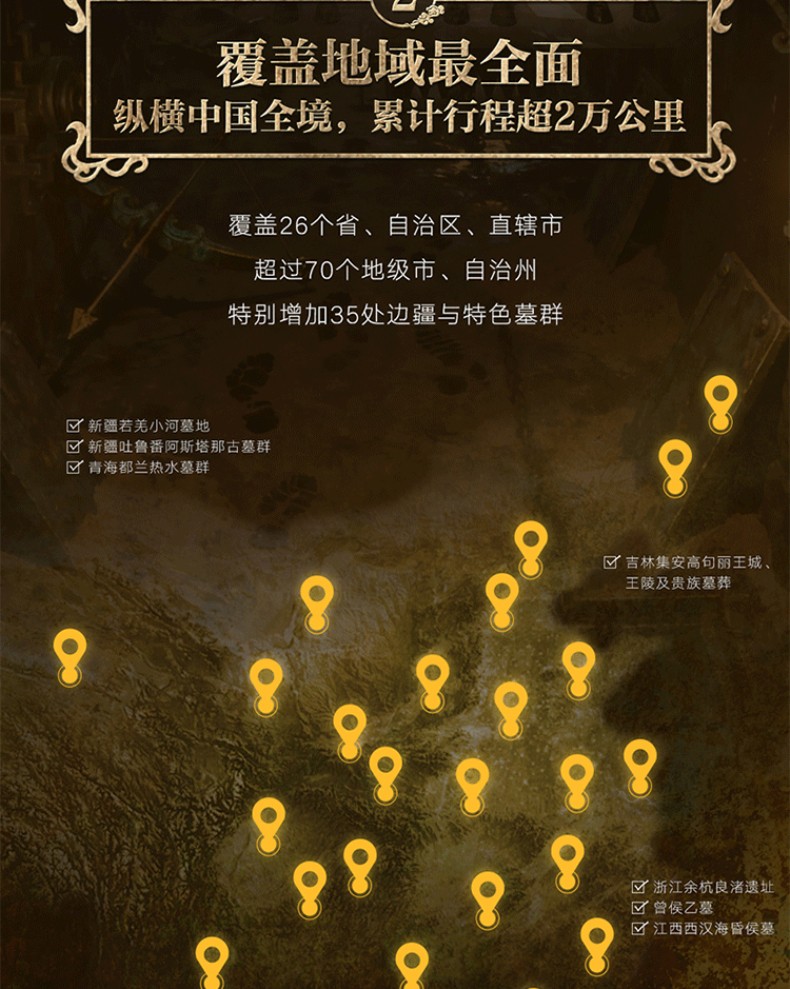 2. 橫跨中國全境地區,累計行程超2萬公里。涵蓋中國全境23個省級行政區,超過65個市級行政區。並突破傳統「中原中心」視角,特別增加35處邊疆與特色墓群,包括寧夏西夏王陵、新疆小河墓地、阿斯塔那古墓群、青海熱水墓群、雲南晉寧石寨山古墓群等,真正讀懂「多元一體」的中華文明格局。