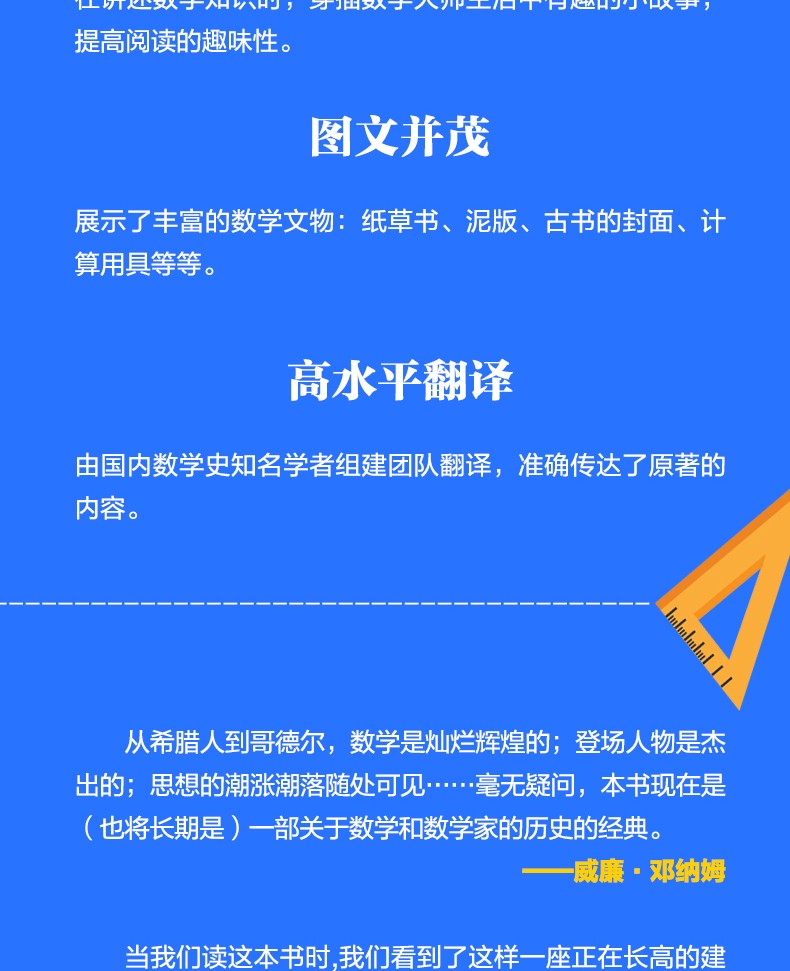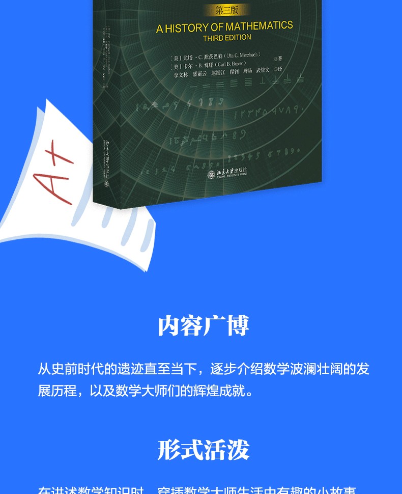 這是一本由大師創作,資深研究人員主持翻譯的傑作,在國際上自第一版出版以來已成為數學史領域的標準參考書,而目前引進的第三版,對第二版做了很大改進,其修訂覆蓋整部作品,並補充了數學史領域的新發現。