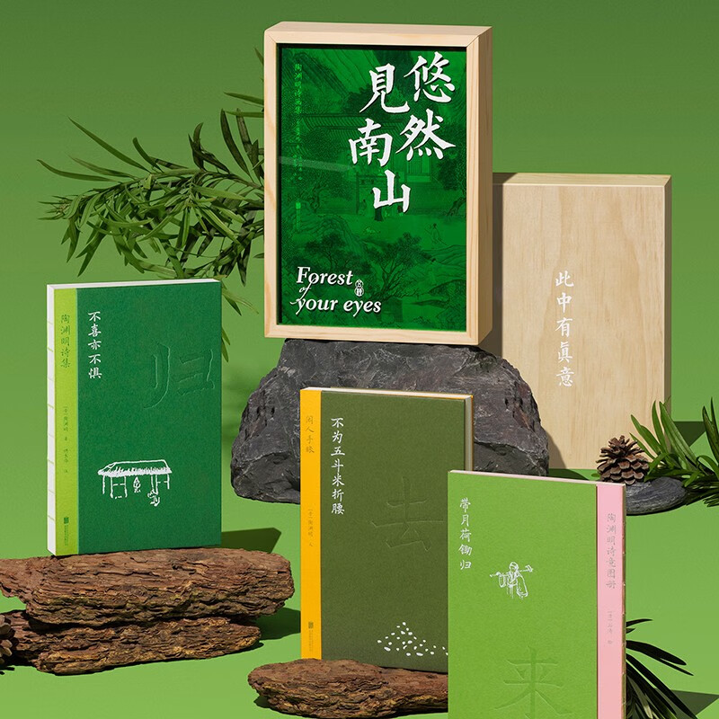 森林綠的壓克力盒蓋如同青山上的薄霧,明代仇英的《桃花源圖》若隱若現,如武陵人初見山口微光。抽拉盒蓋+手工雕刻木盒,還原「初極狹,才通人」的桃源入口感,拉開盒蓋,三冊書從淺碧到墨綠,層層疊疊展現出田園的生機與活力。