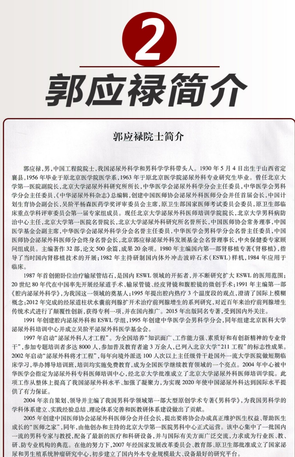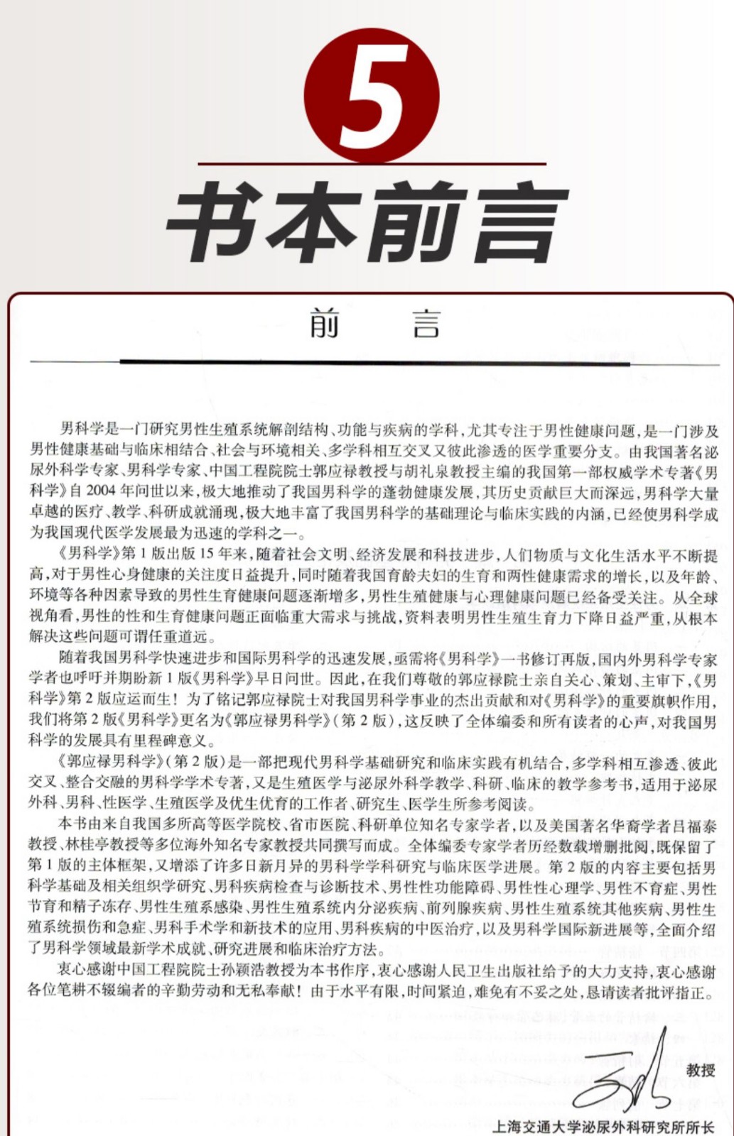 本書男科學的修訂版,由全國 的泌尿外科、男科專家、中國工程院院士、北京大學泌尿外科研究所名譽所長郭應祿教授擔任主編, 外100多位專家、學者編寫的大型學術專著。全書共有230餘萬字,全面介紹了男科學領域 學術成果、研究進展,以及 的臨床治療方法。其主要內容包括:男科學基礎、男科學臨床檢查與診斷技術、男子性功能障礙、男子性醫學、男子不育症、男子節育、性傳播疾病、男生殖系內分泌疾病、前列腺疾病、男科手術學,以及男科病的中醫中藥治療等。