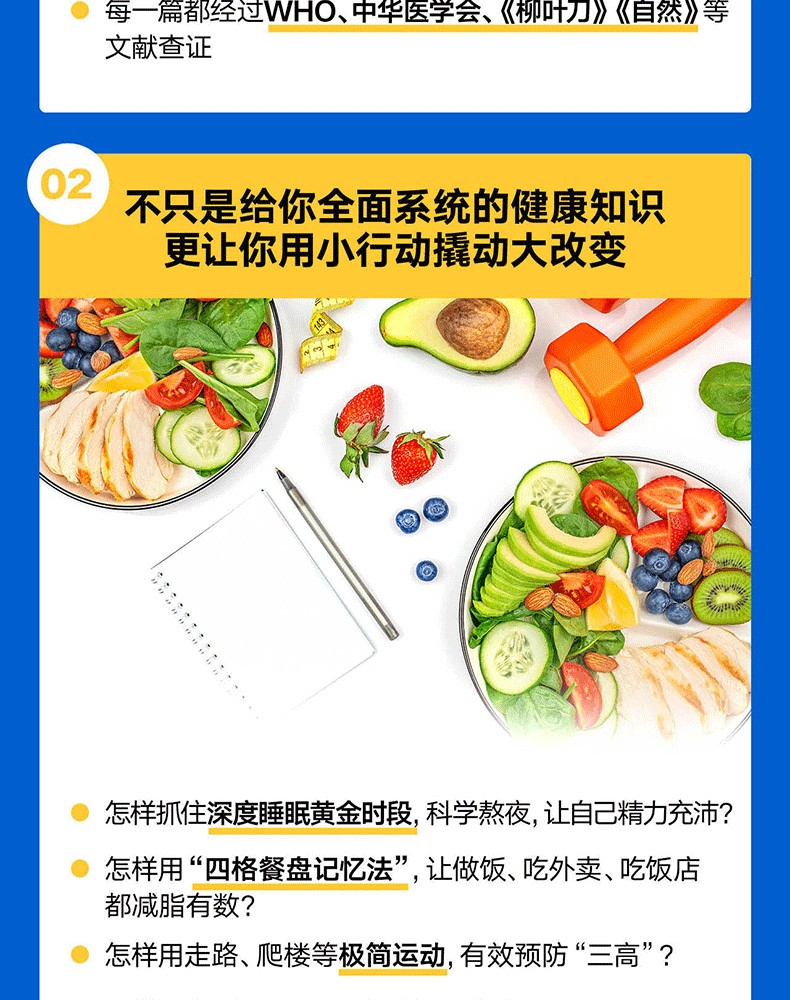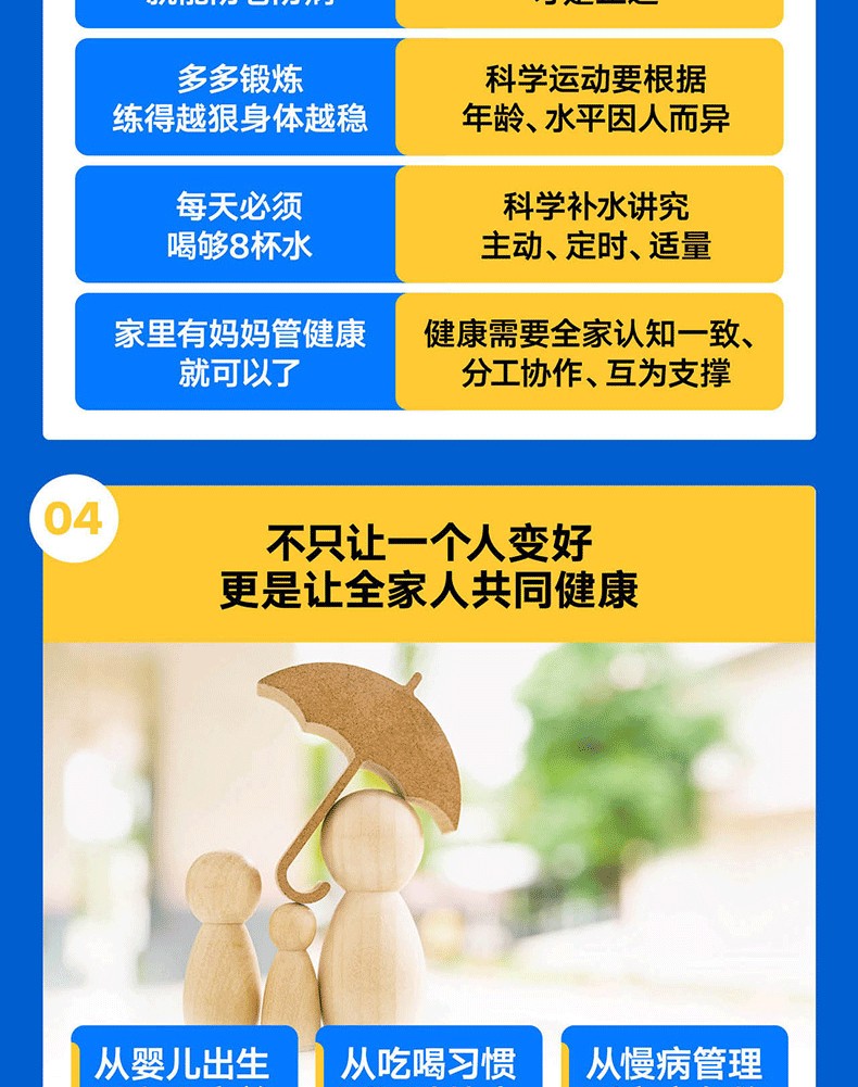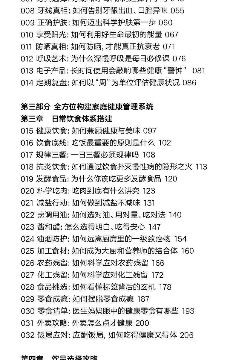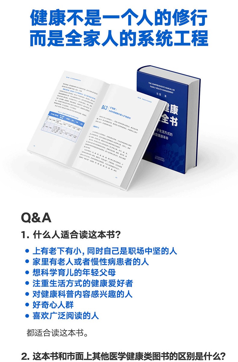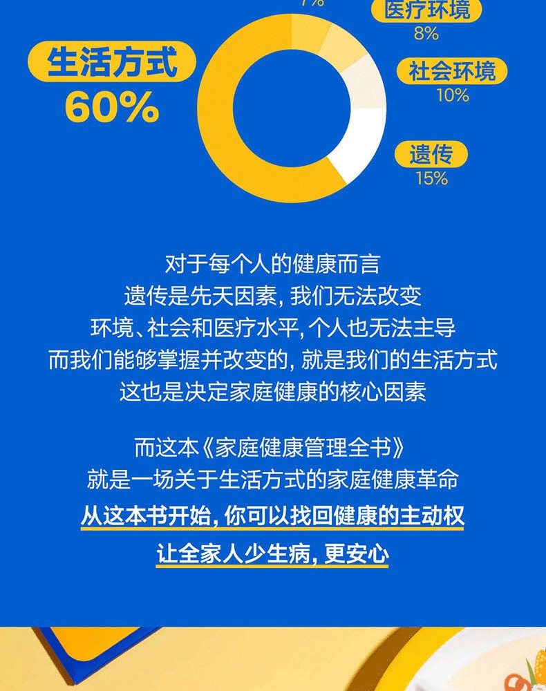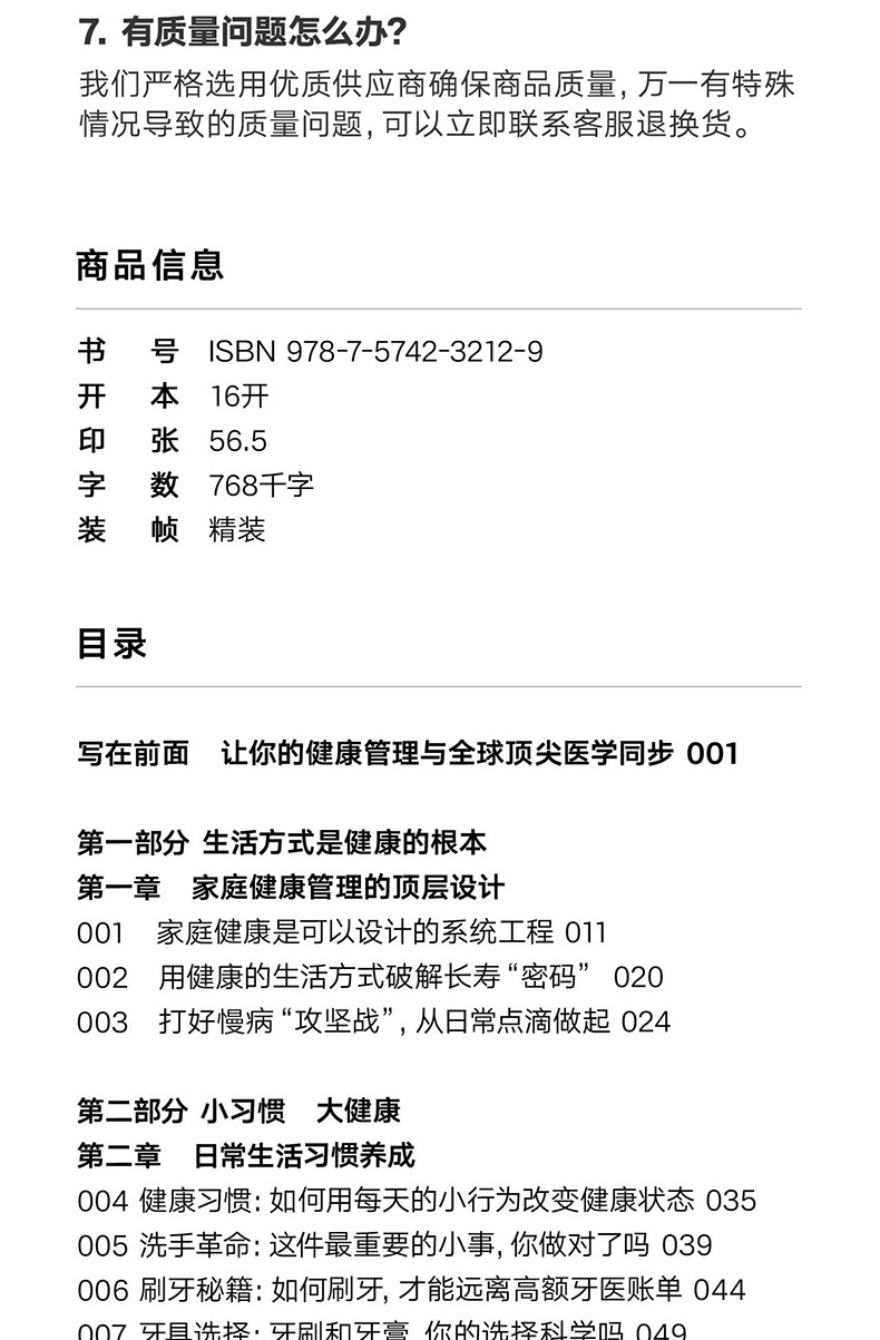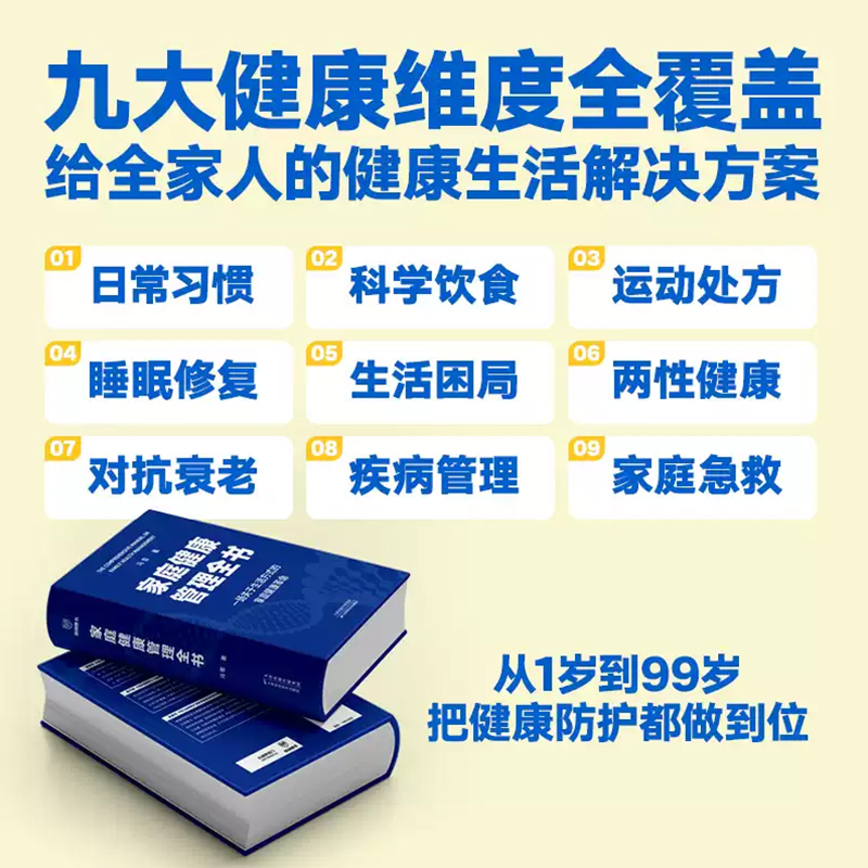文本特色 簡單易懂,搭配翔實的數據,具有較強的可讀性與參考性。 2.裝幀特色 精裝雙封,設計精美。封面採用特種紙,內封觸感膜+燙金工藝,十分有分量。 3.現實意義 為提升家人健康水準、促進全民健康提供有效且實用的參考。