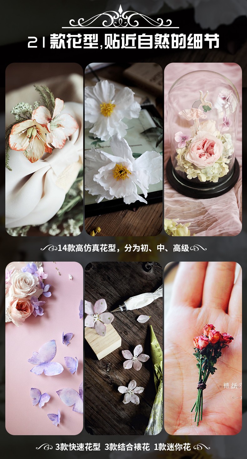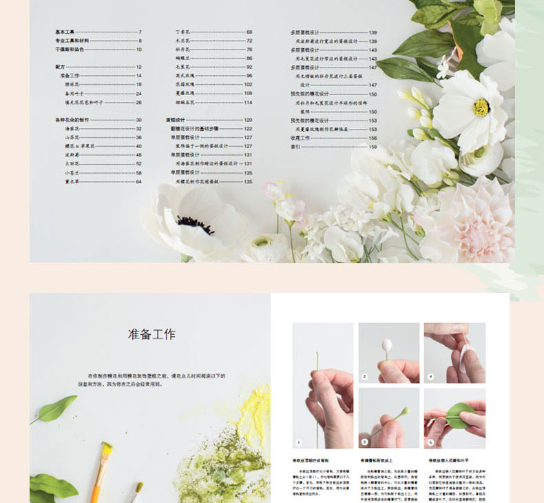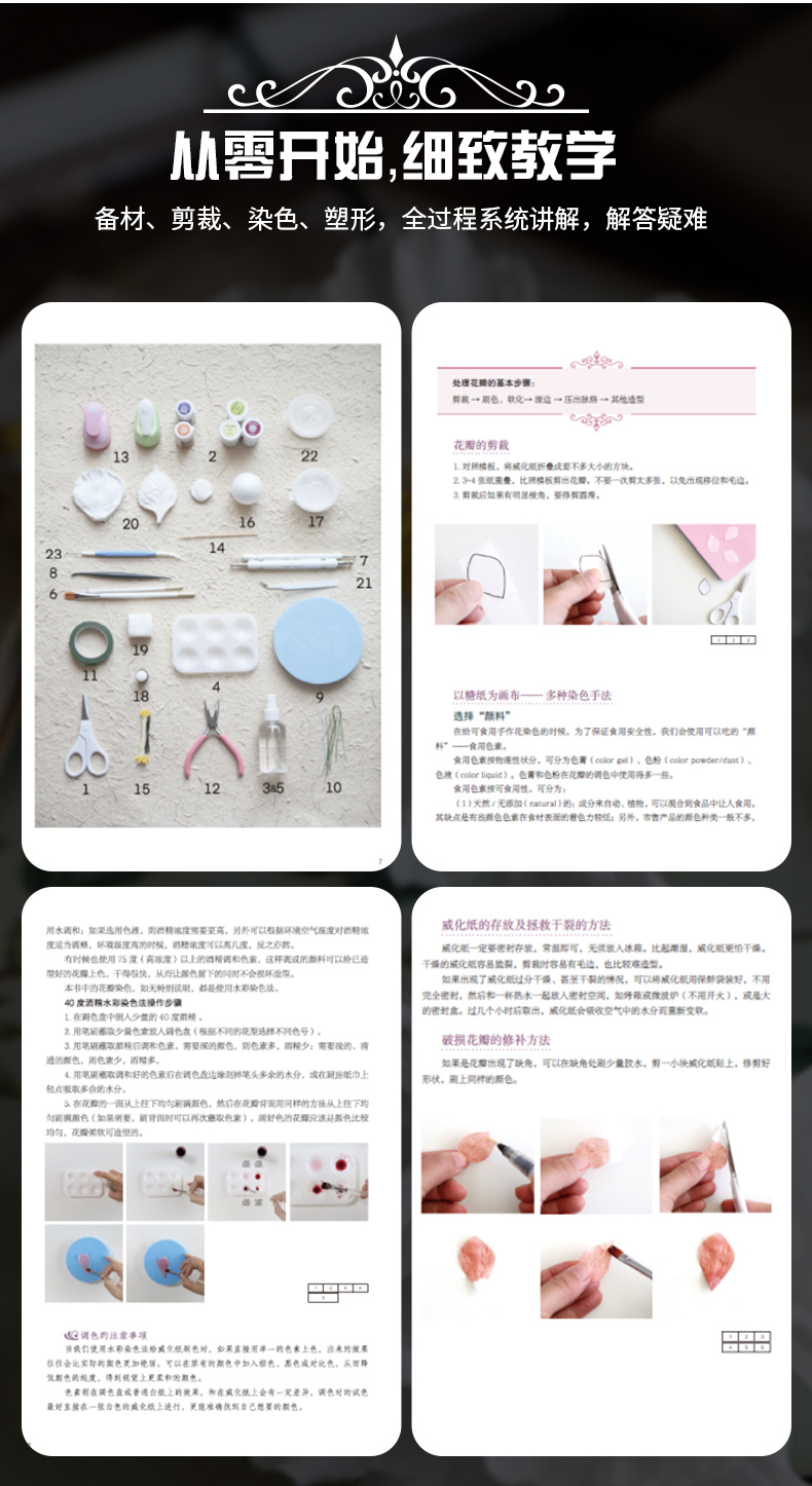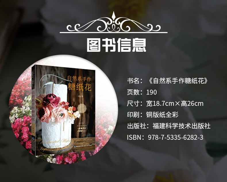 糖紙花的由來、應用優勢,剪裁、染色、塑形、組裝、修補等基礎的製作手法;圖文+小視頻,細緻示範從初級到高級等14款高仿真花型、3款快速糖紙花型、3款糖紙花裱花的做法;糖紙花實際應用案例,婚禮蛋糕甜品台、點心盒、花環、迷你花型……實用附錄,原尺寸花瓣模板隨書附上。