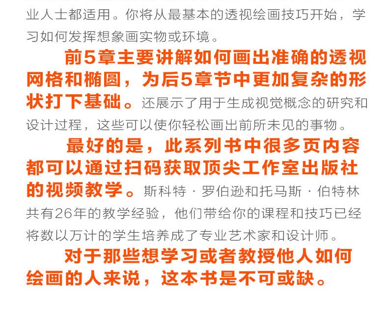 斯科特?羅伯森斯科特?羅伯森擁有20年以上關於設計、繪畫、繪圖以及大學教學和課程設計經驗,對於展示和闡述本書的主題來說, 他具有獨到的、毋庸置疑的專業知識。斯科特已出版了11本設計和概念藝術書籍,還與“日晷工作室”聯合製作了40餘部教學DVD,其中9部是自己授課的DVD。在藝術中心設計學院,他參與設立娛樂設計系,並曾擔任該系主任。他經常受世界各地公司、大學的邀請或通過自己的工作室品牌SRW 授課。